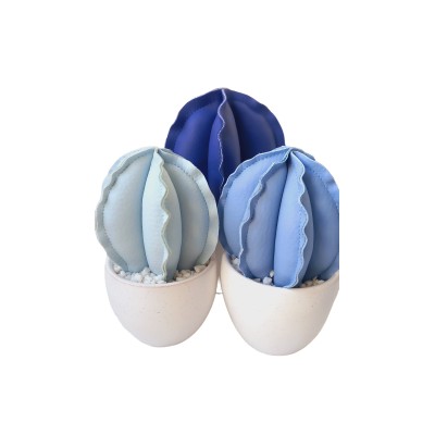 Cactus in tessuto scamosciato color panna e fiore in cotone celeste.