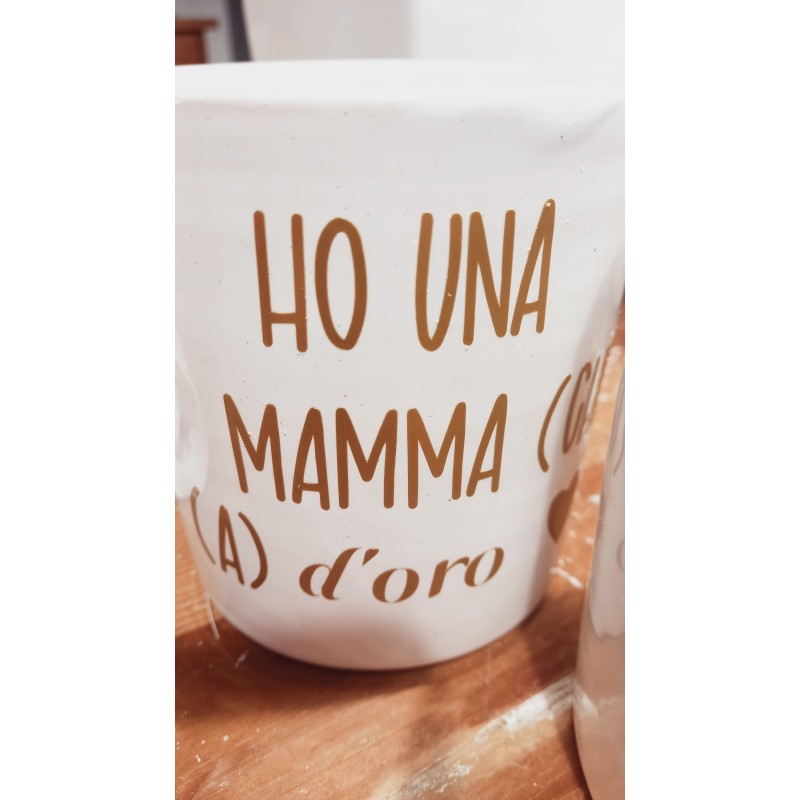 Realizzata in ecopelle oro con anima modellabile e vaso con scritta HO UNA MAMMA CHE (A)D'ORO