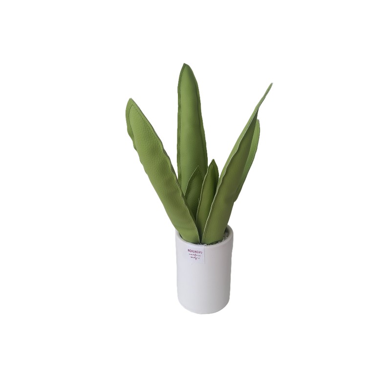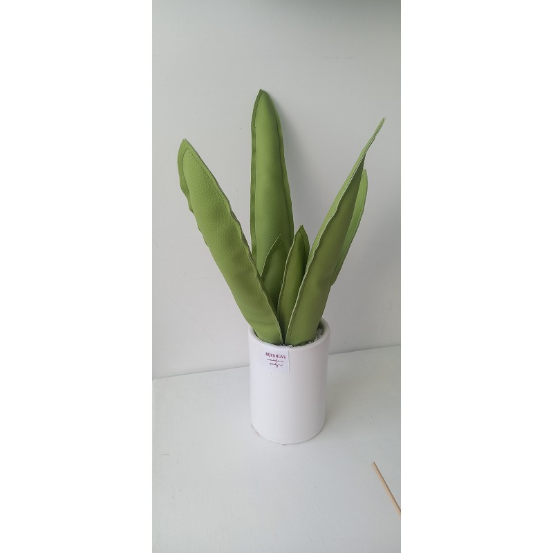 Agave in ecopelle verde oliva, vaso in terracotta smaltato e pietre naturali.